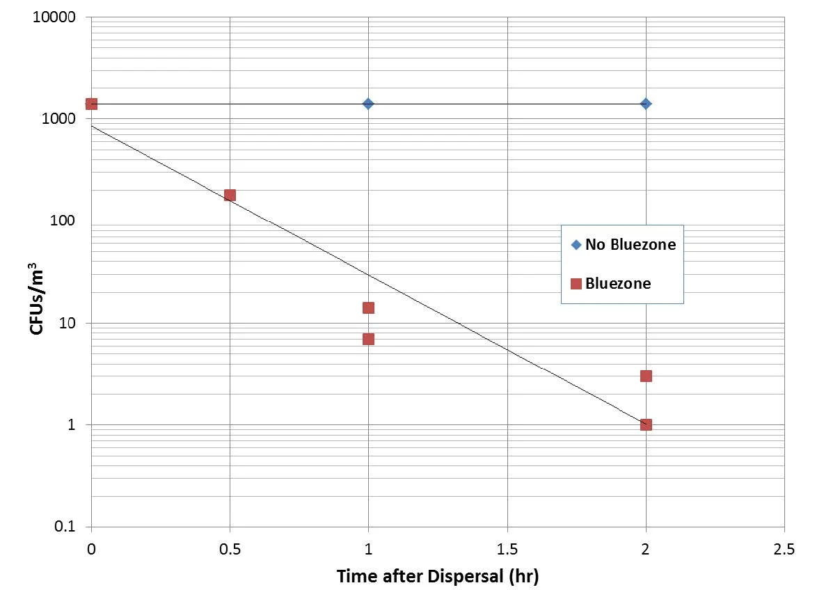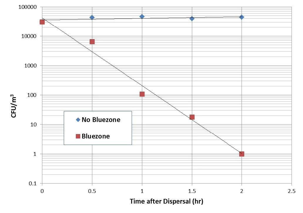 However, with the Bluezone Model 300 turned on, the CFU count is reduced by at least three order of magnitude (three log kill) compared to the natural decay. Counts after one hour are reduced to ~100 per m3 for the bacterial spores and ~10 per m3 for the mold spores. After two hours the counts are ~ 1 per m3 for both organisms. The Bluezone is thus responsible for a kill of greater than 99% after one hour and greater than 99.9% after two hours, relative to the baseline counts.