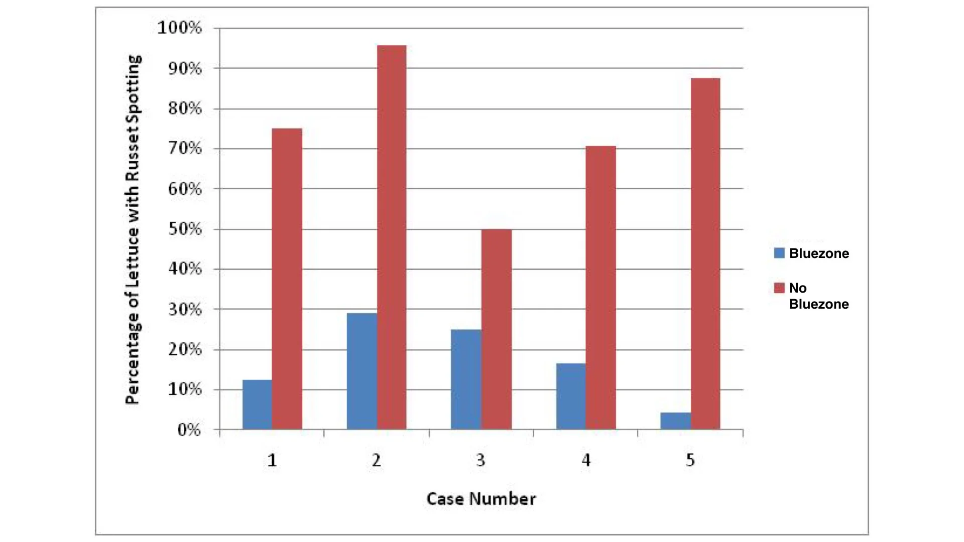 The Bluezone® Fresh Preservation Technology had reduced total bacterial count, yeast and moulds. Use of the Bluezone® significantly reduced russet spotting in Wrapped Iceberg Lettuce over the 21 day storage period.
